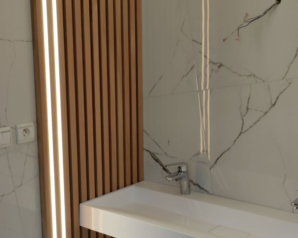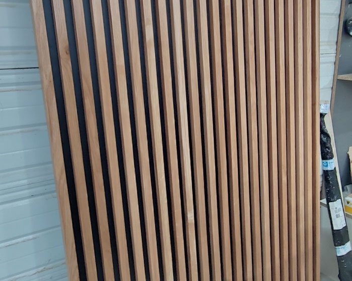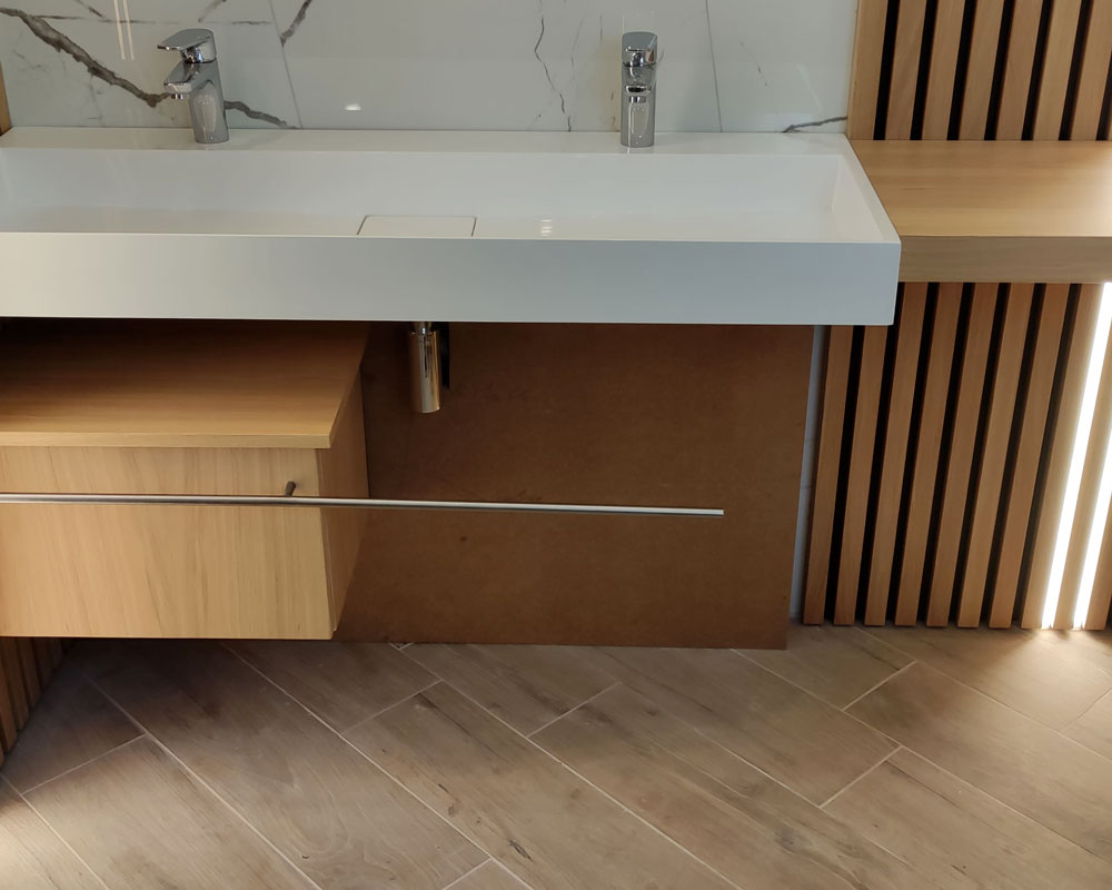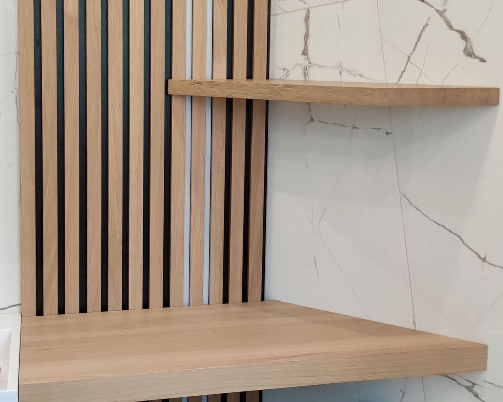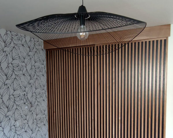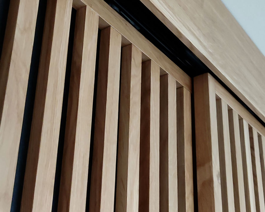 Réalisation d’agencements sur mesure dans les différentes pièces de l’appartement. Les panneaux claustra en chêne sur fond noir ont été fabriqués en atelier et intégrés en façades coulissantes de placards ainsi que sur les murs pour renforcer l’identité design de l’appartement. Dans certains espaces, un éclairage intégré a été ajouté pour valoriser les matériaux et créer une ambiance chaleureuse.