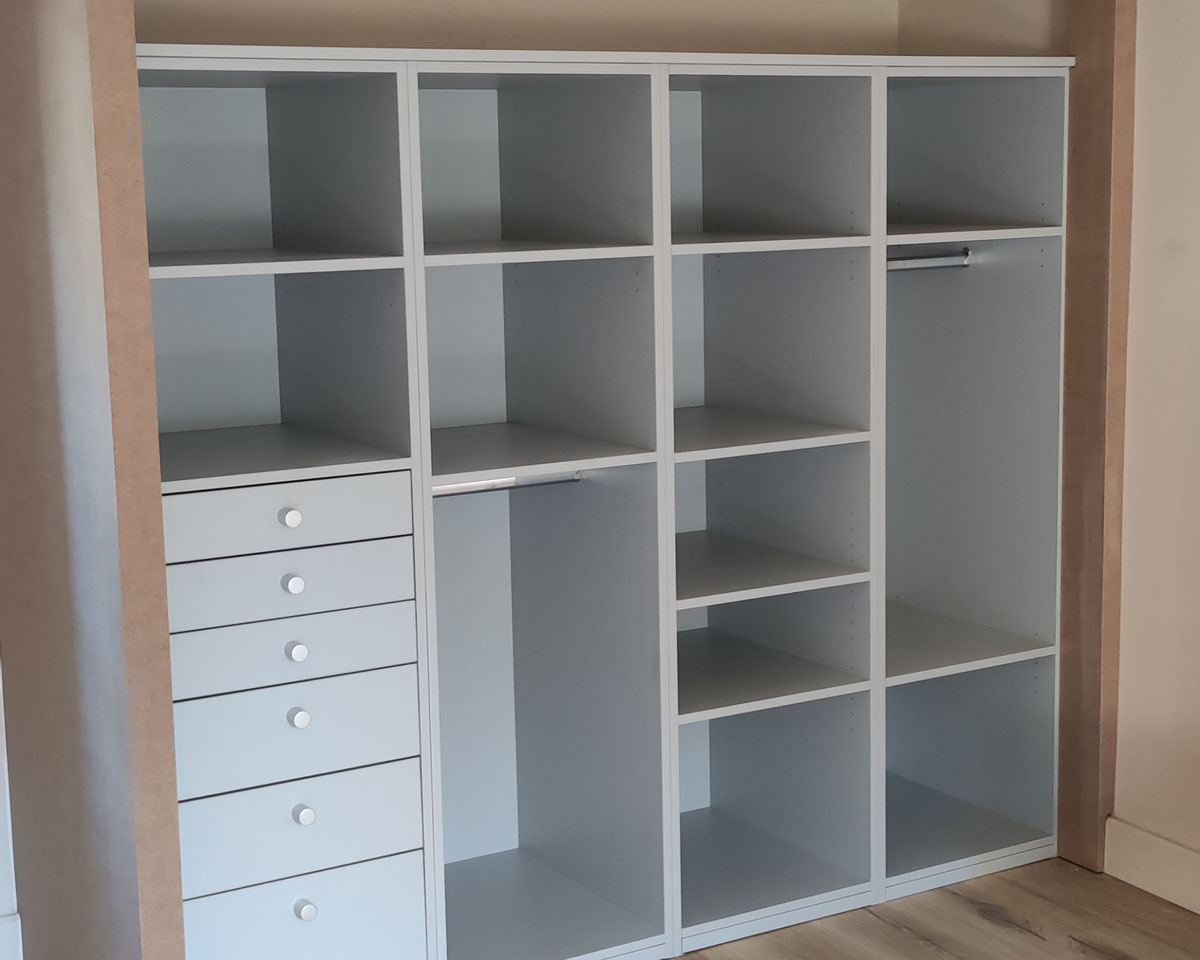 Fabrication d’un dressing sur mesure comprenant penderie et tiroirs pour optimiser le rangement et la polyvalence. La partie visible du dressing a été prévue pour être peinte ultérieurement afin de s’harmoniser avec les murs de la chambre. Des façades coulissantes ont été installées pour fermer le dressing.