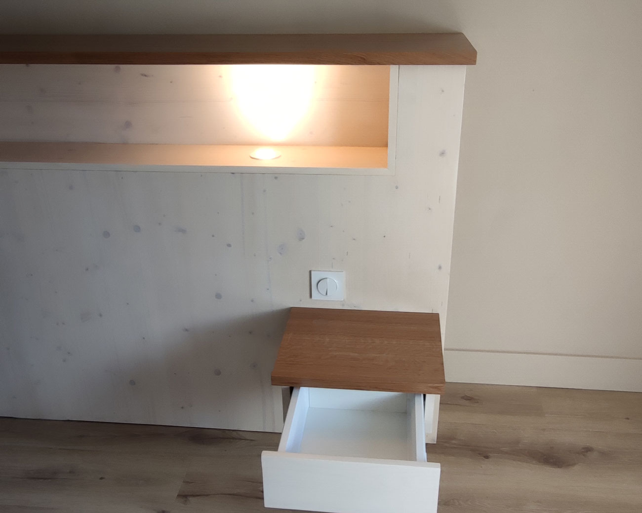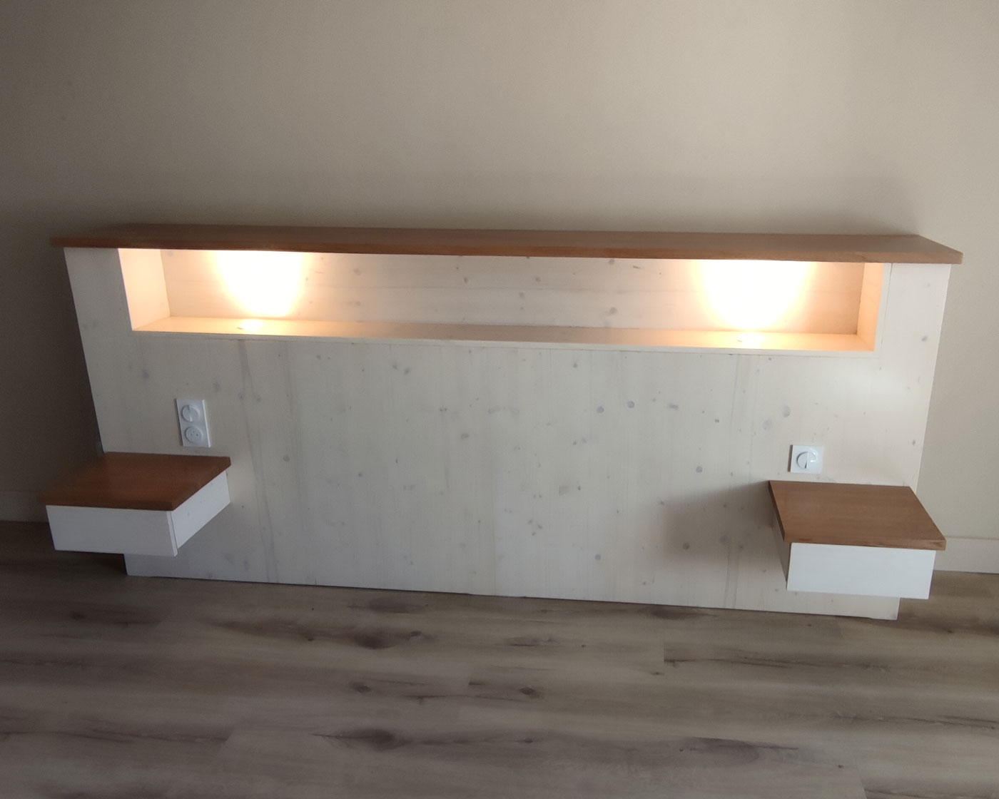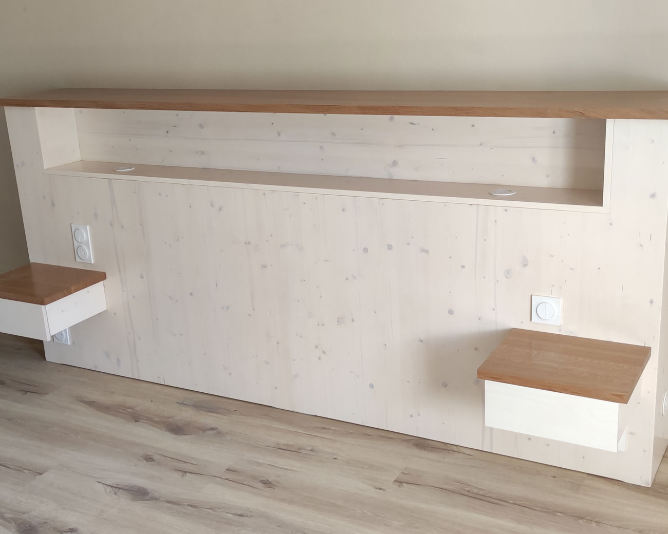 La tête de lit en bois blanchi intègre plusieurs espaces de rangement, dont des tables de chevet intégrées de chaque côté. L’agencement comprend également l’intégration de prises électriques, interrupteurs et éclairages pour un confort maximal.