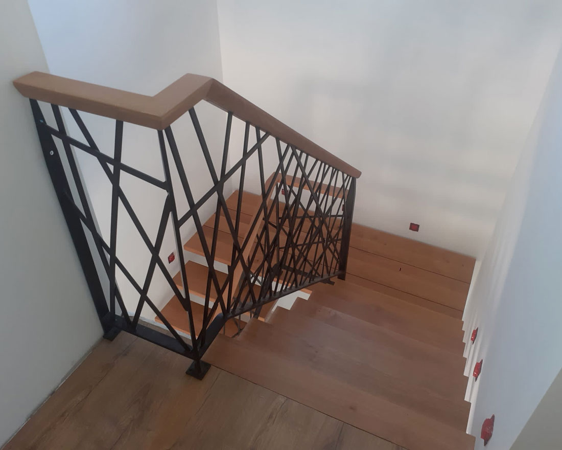 Réalisation d’un escalier sur mesure demi-tournant avec palier intermédiaire. Le limon central est en métal, apportant finesse et solidité, tandis que les marches sont en chêne pour ajouter chaleur et authenticité. Un garde-corps avec des motifs déstructurés a été conçu pour renforcer le style contemporain. Le bois a également été utilisé pour les mains courantes afin d’assurer une cohérence esthétique et un confort d’utilisation.