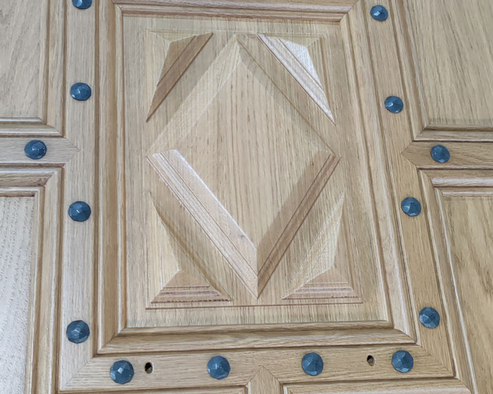 Fabrication d’une porte sur mesure en chêne dans notre atelier, avec des pointes martelées pour rappeler le style ancien. Une sculpture centrale a été réalisée pour offrir une signature unique à la porte. La finition a été appliquée avec une lasure naturelle, mettant en valeur les aspérités et le caractère authentique du bois.
